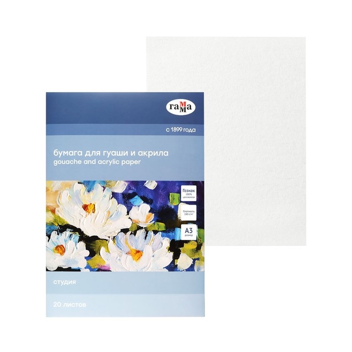 Папка для гуаши и акрила ГАММА серии «Студия» формата А3 (297*420 мм) плотностью 180 г/м2, марки А. В папке 20 листов, изготовленных из 100% целлюлозы на заводе «Гознак» без использования оптических отбеливателей. Бумага обладает естественным белым цветом, гладкая по обеим сторонам и имеет приятную фактуру. Обладает высокой степенью адгезии и не требует дополнительной подготовки. Бумага рекомендуется для водорастворимых красок – гуаши, акрила, темперы, подойдёт даже для несложных акварельных сюжетов, а также карандашей. Папка представлена в картонной обложке.