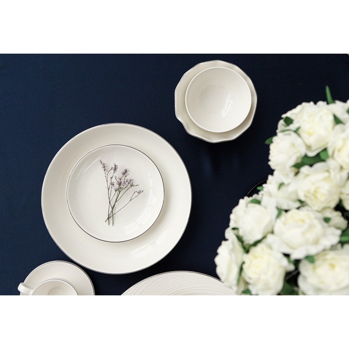 Посуда Magistro серии La Perle покорит лаконичным дизайном и молочной белизной натурального фарфора. Современная форма предметов подчеркнута элегантной серебряной окантовкой. Изделия из линейки La Perle можно использовать как в повседневной, так и в праздничной сервировке. Посуда станет чудесным подарком и дополнит коллекцию столового семейного фарфора.