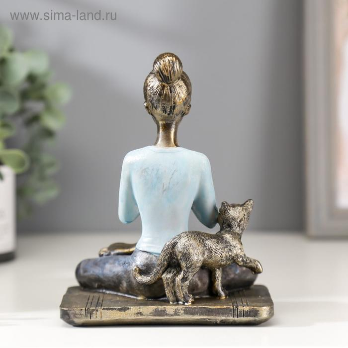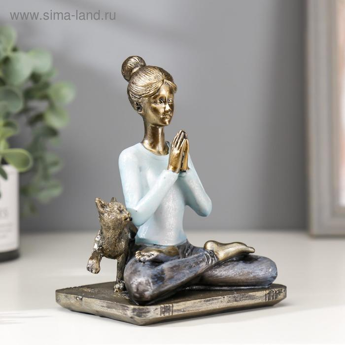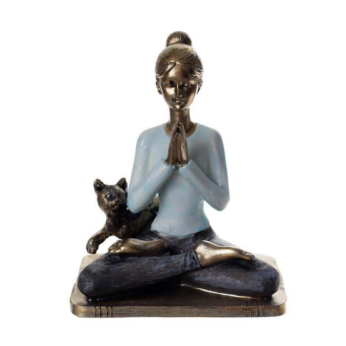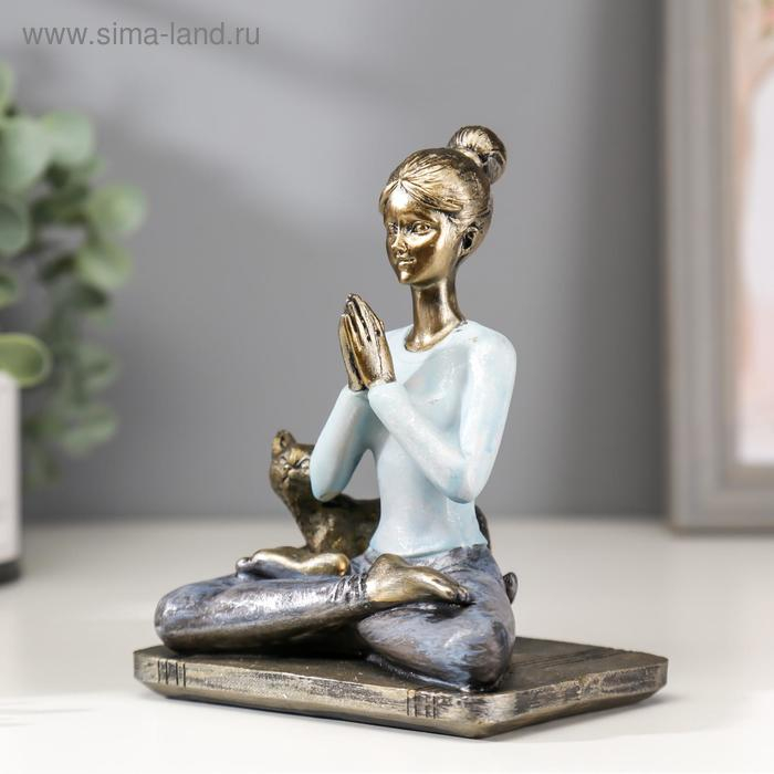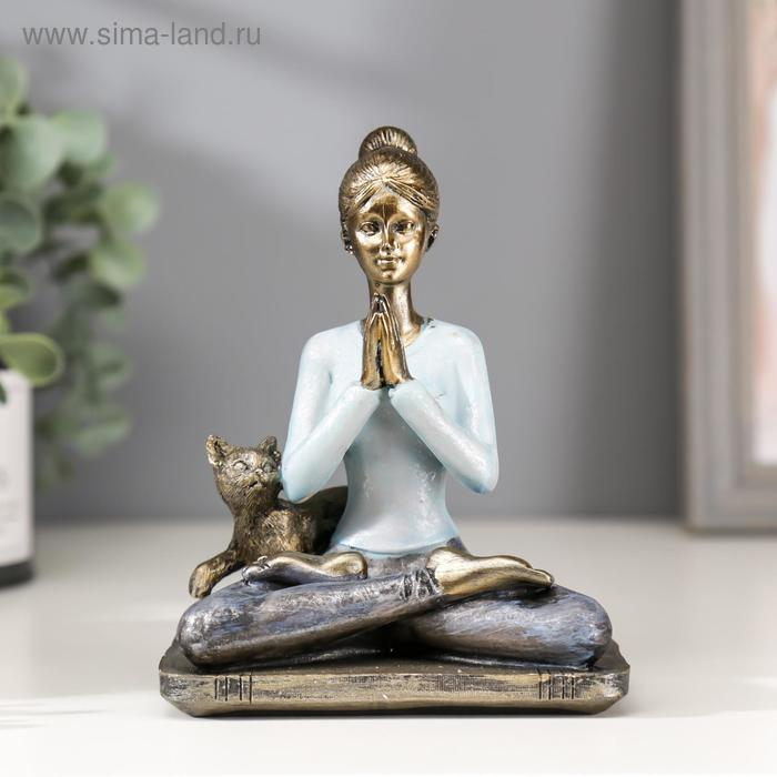 Сувенир полистоун "Девушка в позе лотоса, с котом" синий 14х11х7,8 см