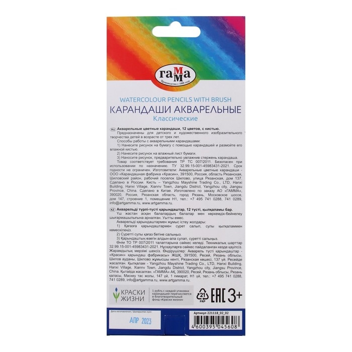 Карандаши акварельные 12 цветов, Гамма "Классические", с кистью, шестигранные, заточенные, картонная упаковка