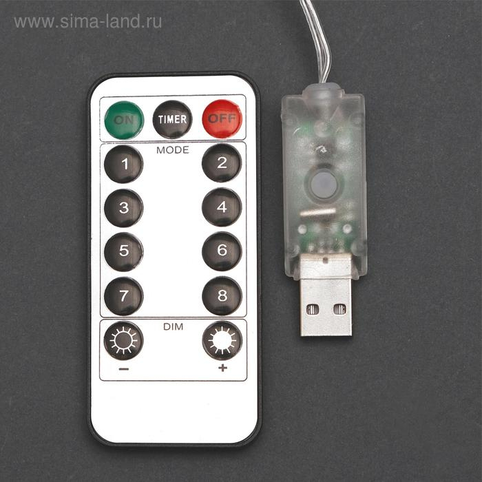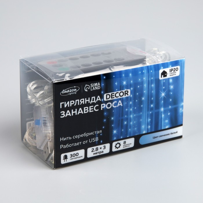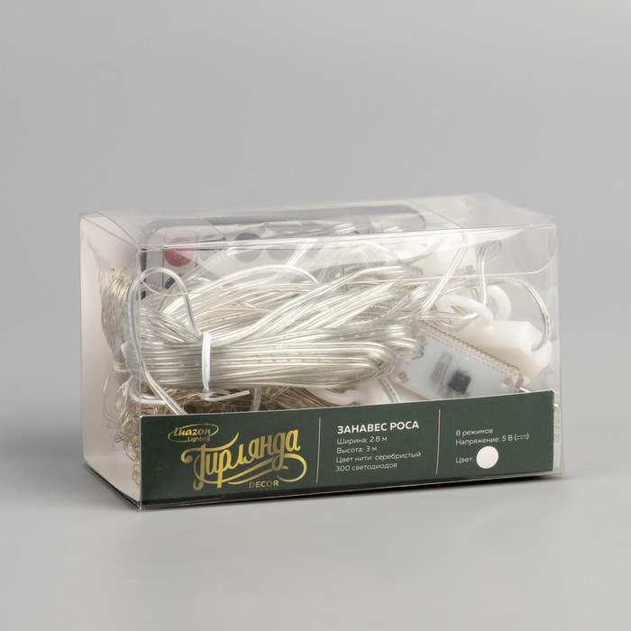Гирлянда «Занавес» 2.8 × 3 м роса на крючках, с пультом, IP20, серебристая нить, 300 LED, свечение белое, 8 режимов, USB