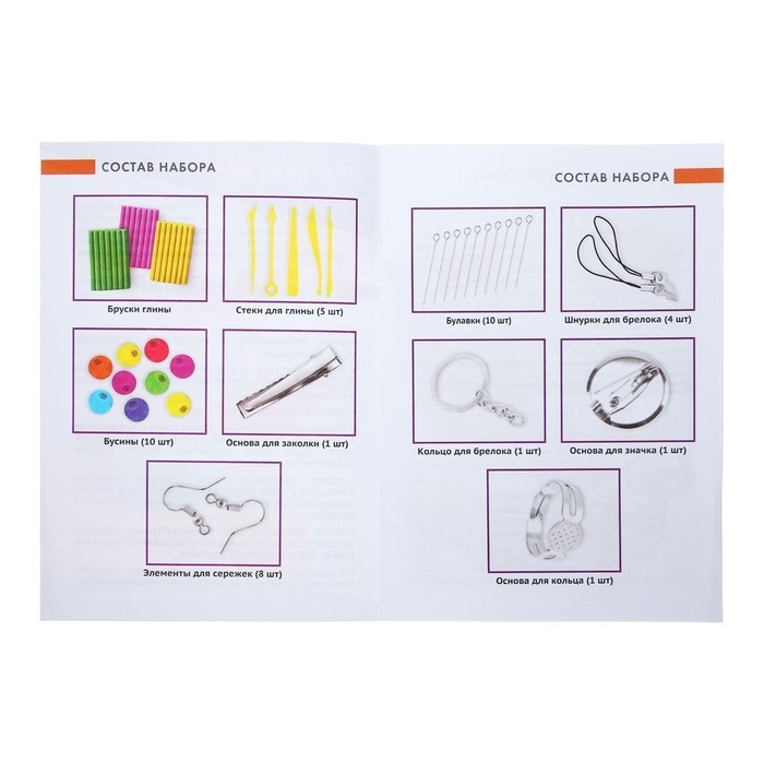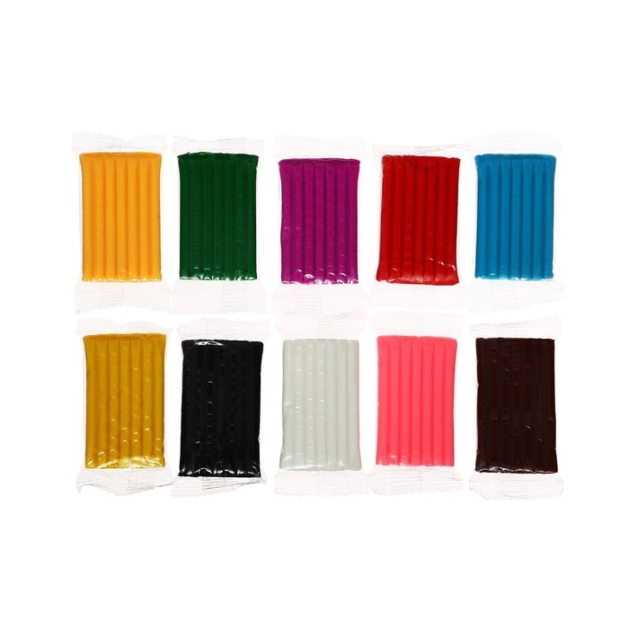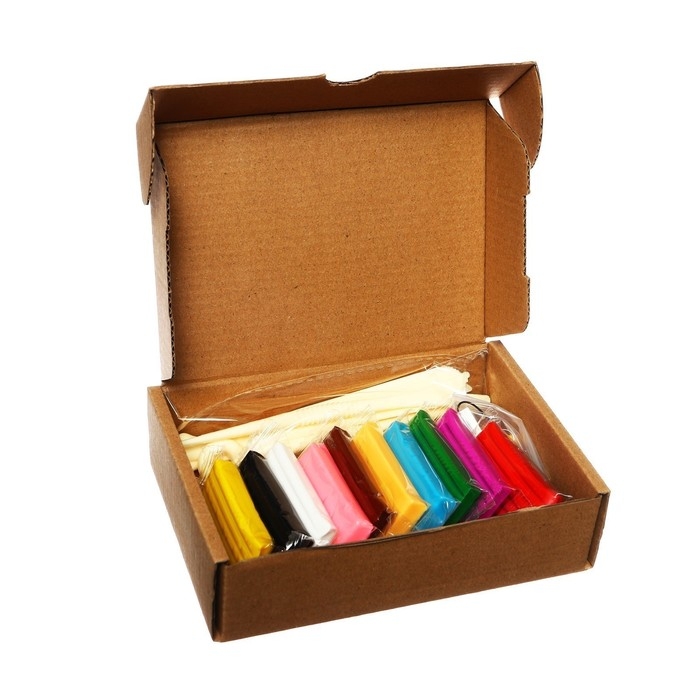 Набор включает в себя 10 брусков (по 20 г) полимерной глины разного цвета, 5 пластиковых стеков, комплект аксессуаров для создания поделок и Инструкцию по эксплуатации. Глина ярких и насыщенных цветов, не пачкает и не сушит руки, легко смывается с рук и рабочей поверхности водой или влажными салфетками.
