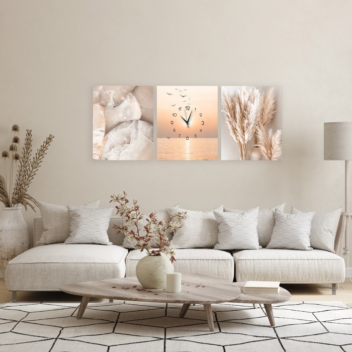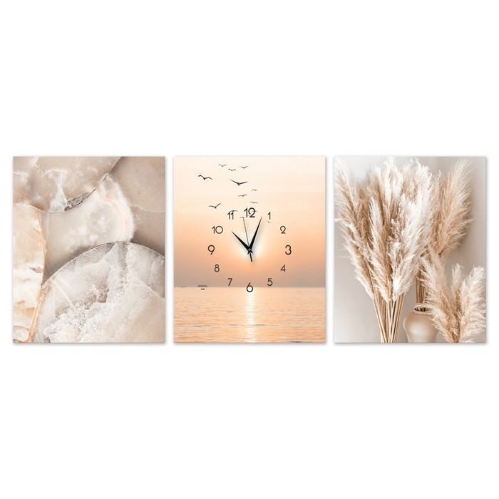 Стильные бесшумные часы-картина удачно оформят любой интерьер от современного до классического. Модульная картина с часами оснащена кварцевым часовым механизмом с тихим ходом. Этот триптих идеально подойдет для кухни, а также спальни и гостиной, кабинета, офиса, прихожей, пригодится в квартире, дома, на даче.
