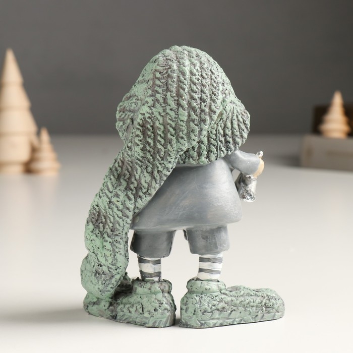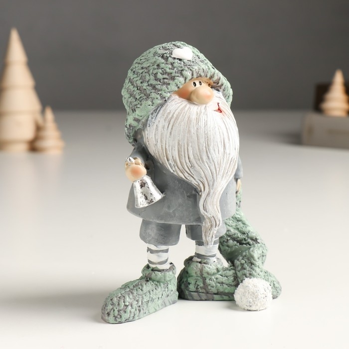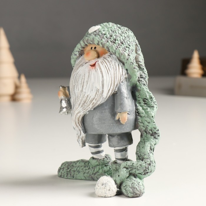 Сувенир полистоун "Дед Мороз в длинном вязанном колпаке с колоколом" серый 6,5х11,5х14 см