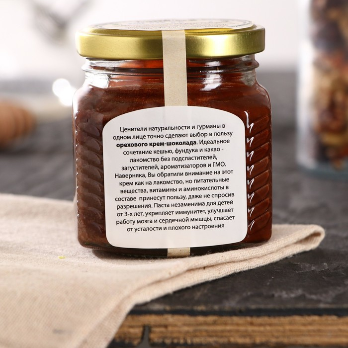 Ценители натуральности и гурманы в одном лице точно сделают выбор в пользу этого продукта. Идеальное сочетание кешью, фундука и какао - лакомство без подсластителей, загустителей, ароматизаторов и ГМО. Наверняка, Вы обратили внимание на этот крем как на лакомство, но питательные вещества, витамины и аминокислоты в составе принесут пользу, даже не спросив разрешения.