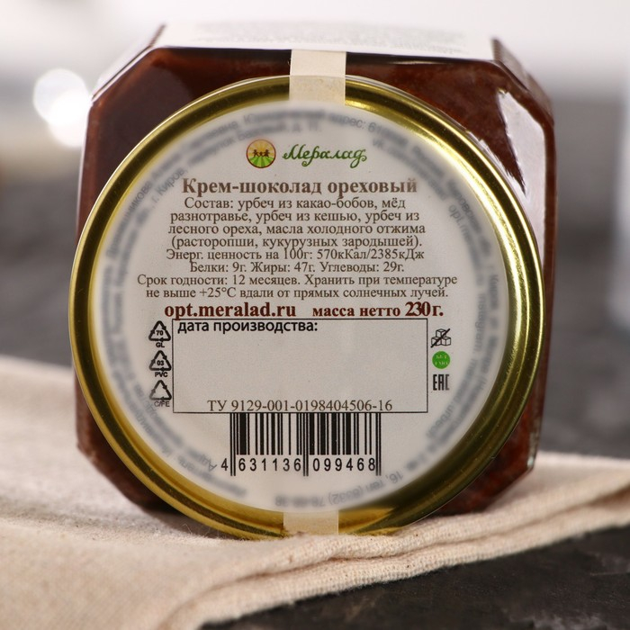Состав: урбеч из какао-бобов, мёд липовый, урбеч из кешью, урбеч из лесного ореха, масло кукурузных зародышей.
