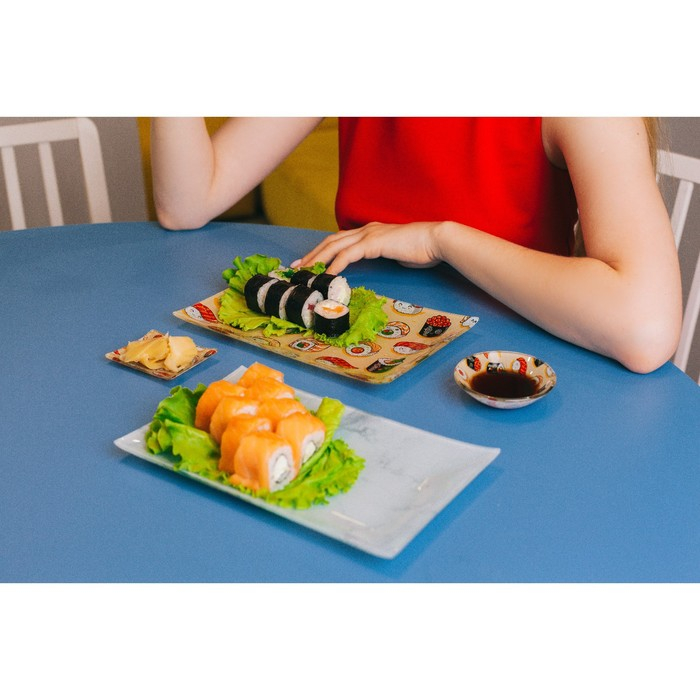 - Удобство использования: набор включает в себя все необходимые предметы для сервировки суши: два соусника и подставку.