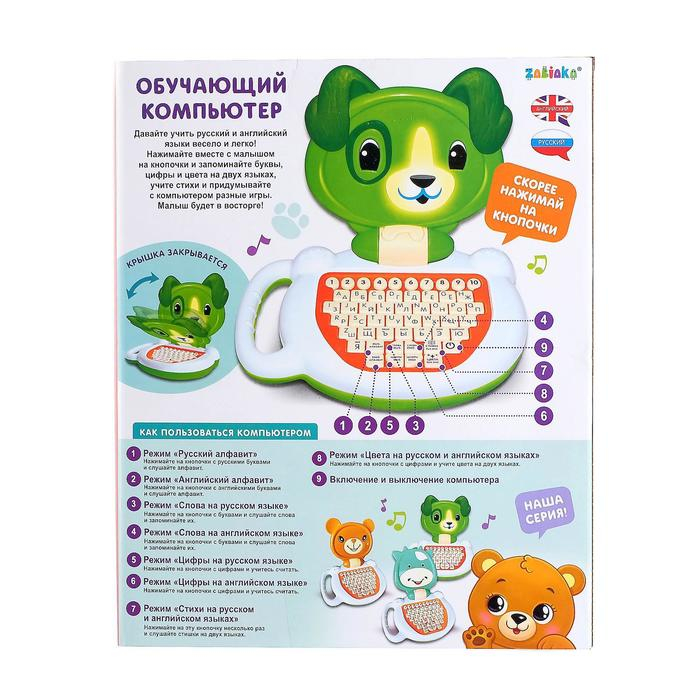 Обучающий компьютер «Медвежонок» — это увлекательная развивающая игрушка, которая познакомит малыша с алфавитом, цифрами, цветами, основами счёта, правописания и логики, а также развлечёт стихами. Изучайте все программы на двух языках: русском и английском.
