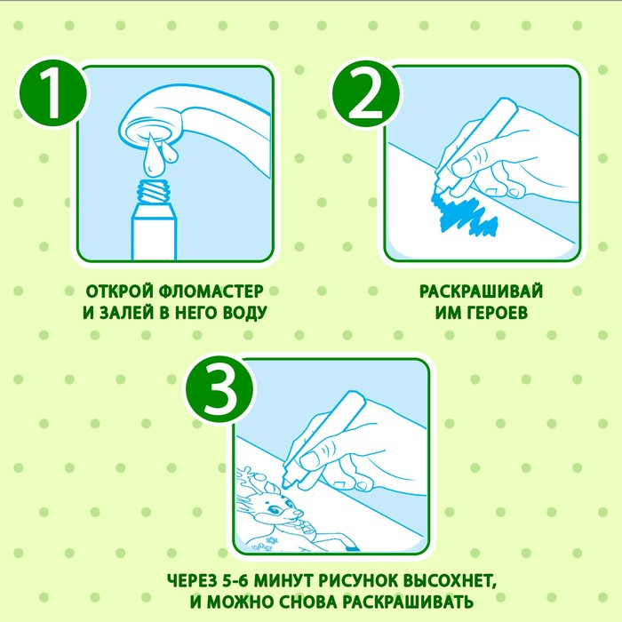 - Через 5–6 минут вода высохнет и рисунок можно снова раскрашивать.