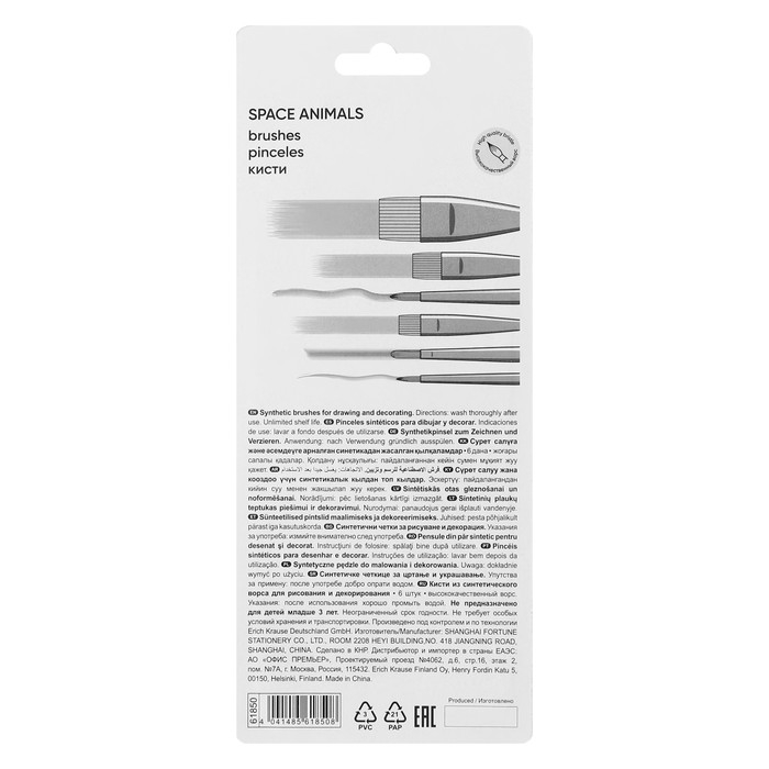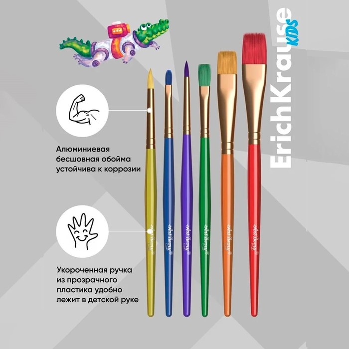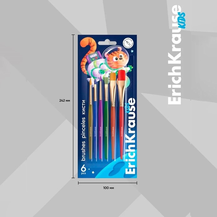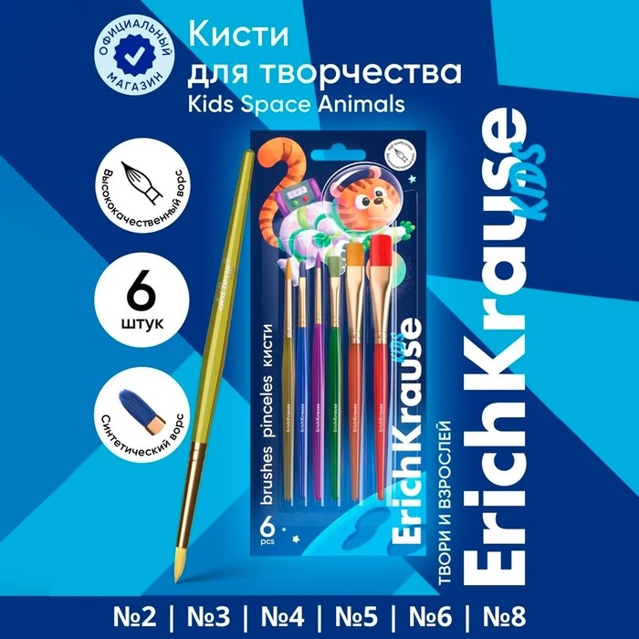 Набор кистей синтетика 6 штуки, ErichKrause "Space Animals" для творчества, в блистере