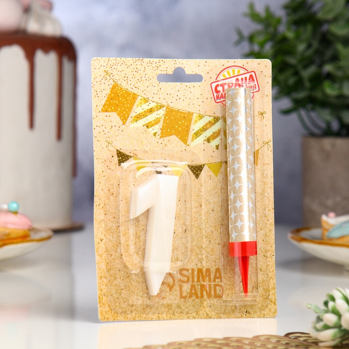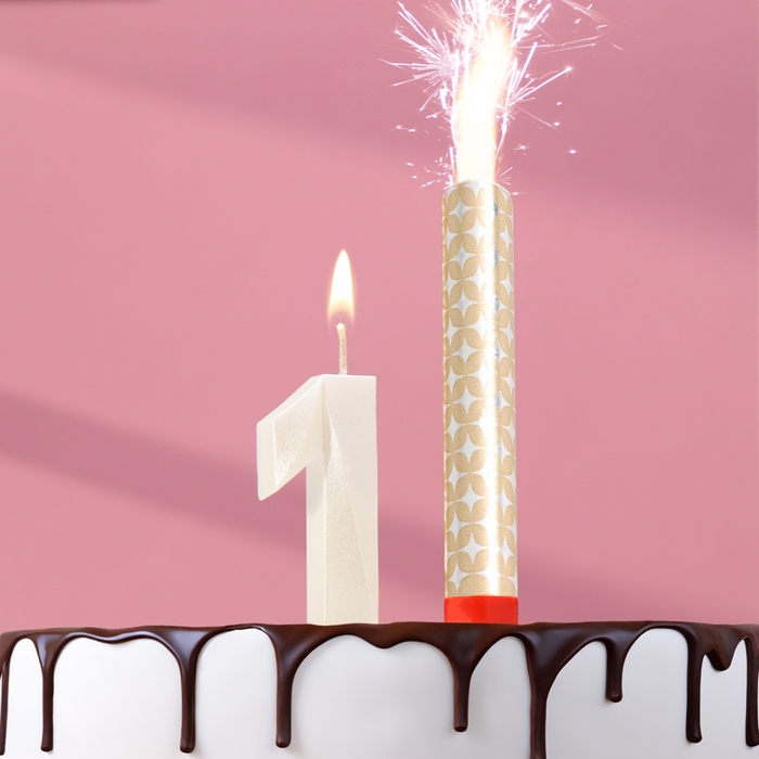 Свеча в торт "Грань + фонтан", цифра "1", жемчужный, 6,5 см