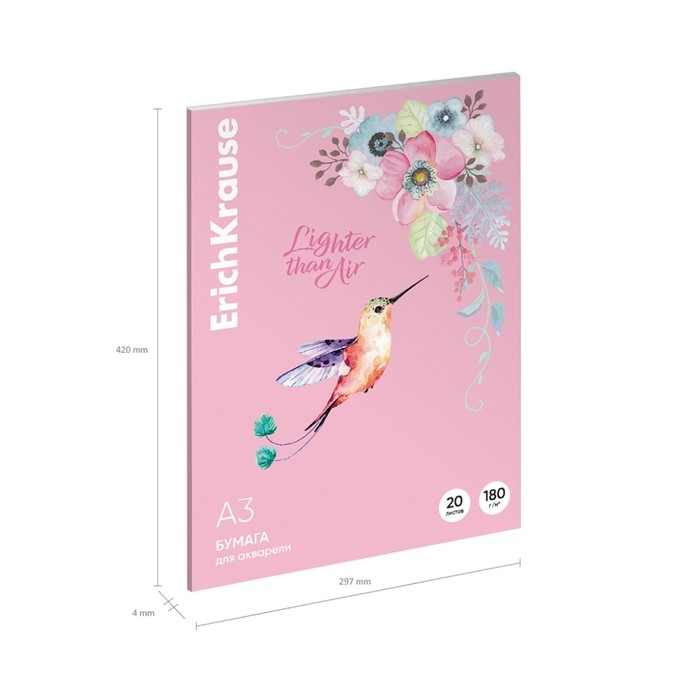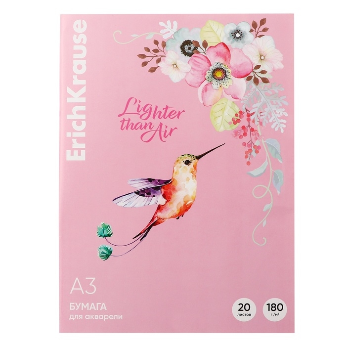 Бумага для акварели А3, 20 листов, ErichKrause "Колибри", блок 180 г/м², 100% белизна, картонная папка