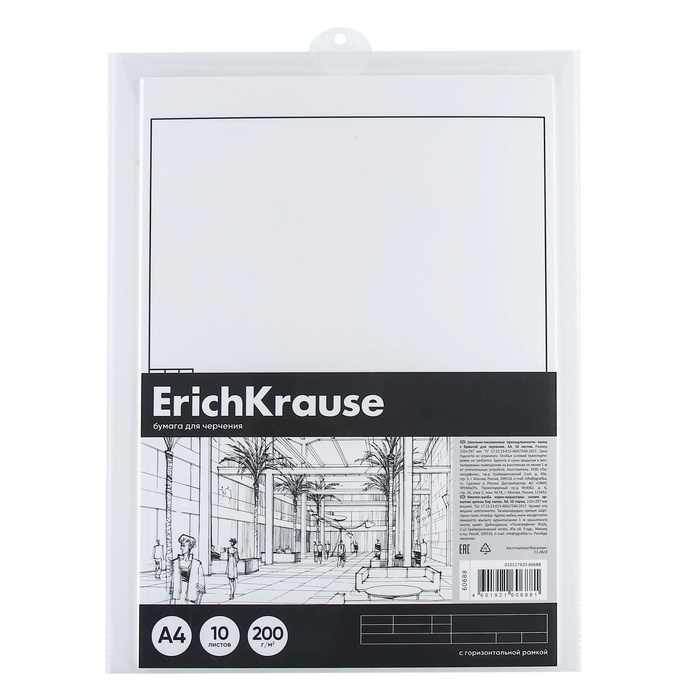 Бумага для черчения А4, 10 листов, блок 200 г/м², ErichKrause "Art", горизонтальная рамка, в пластиковой папке