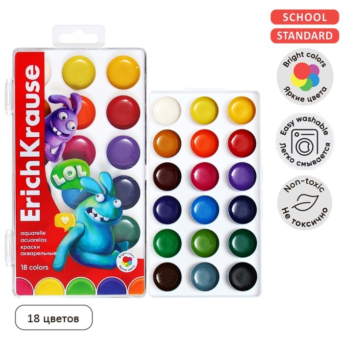 Акварельные краски ErichKrause – оптимальный выбор для школьного рюкзака. Новая уникальная формула акварели позволяет краске значительно легче разводиться водой, хорошо удерживаться кистью и равномерно ложиться на бумагу, создавая мягкие переходы цвета. По мере высыхания акварельный рисунок приобретает матовый насыщенный оттенок без посторонних бликов и затеков. Краска наиболее точно передает игру цвета и света на рисунке, создает цветовые комбинации. Для работы с акварелью лучший эффект достигается при использовании акварельной бумаги ErichKrause.