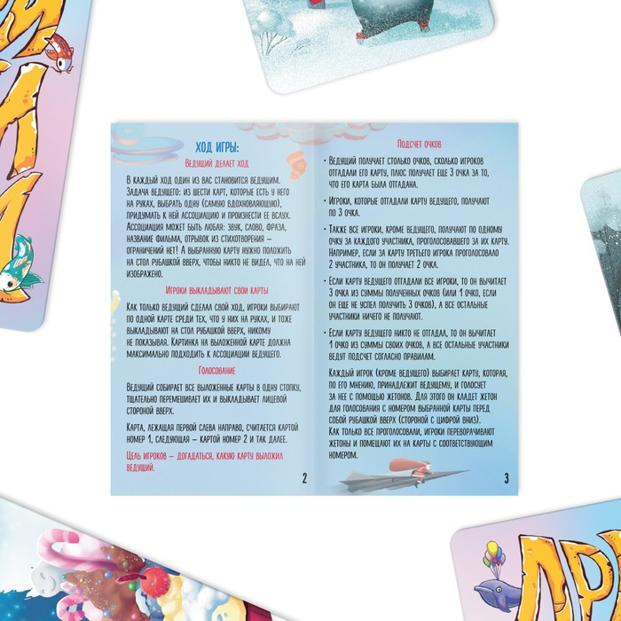 - Если абсолютно все игроки отгадали карту ведущего, он не забирает её себе, а скидывает в отдельную колоду сброса (это значит, что ведущий подобрал слишком очевидную ассоциацию).