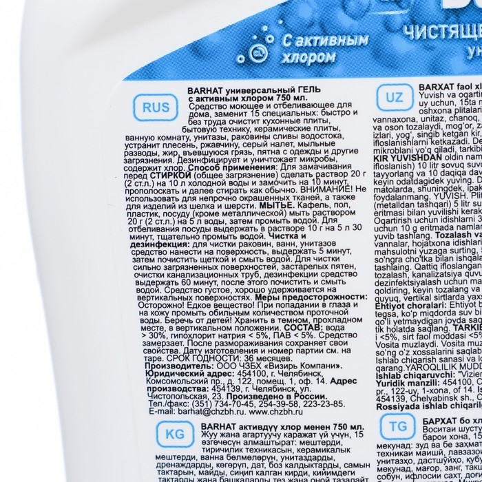 Выберите универсальное чистящее средство BARHAT с активным хлором и наслаждайтесь идеальной чистотой и безопасностью в вашем доме.