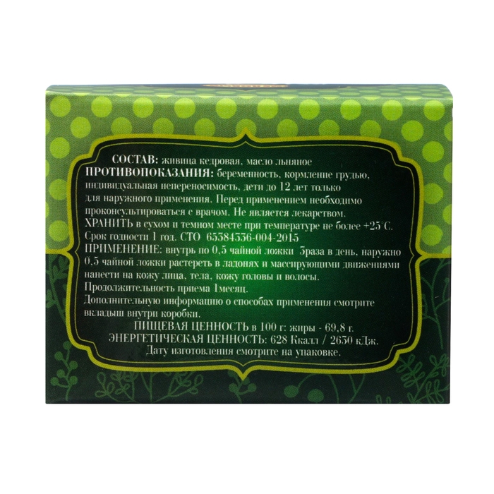 Продукт не содержит никаких добавок и является полностью натуральным. Живица кедровая широко используется в народной медицине благодаря своим целебным свойствам. Она оказывает противовоспалительное, противогрибковое и ранозаживляющее действие. Также живица кедровая может использоваться для профилактики различных заболеваний.