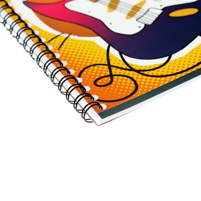 Тетрадь для нот формата А4 (200x297 мм). Ориентация - вертикальная. Обложка из высококачественного мелованного картона плотностью 190 г/м2. В блоке 24 листа. Бумага офсетная плотностью 80 г/м2. Цвет линовки - черный. Тип скрепления - скоба. Имеет справочный материал и вспомогательные линии нотного стана. Тетради одного дизайна упакованы в термоусадочную пленку по 5 штук. Товар поставляется в нескольких вариантах дизайна без возможности выбора.