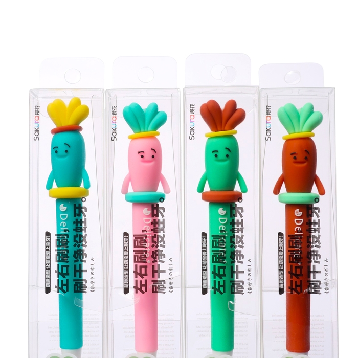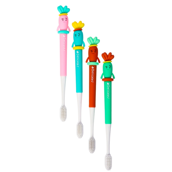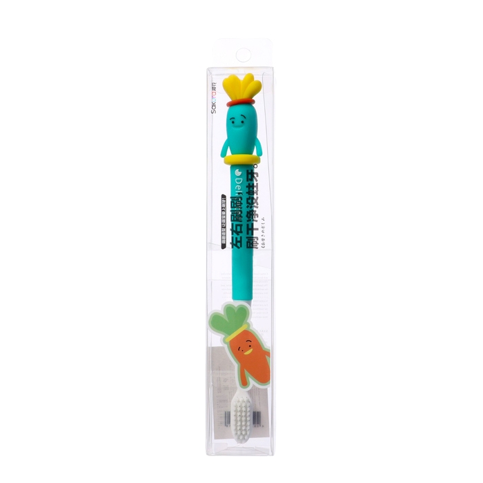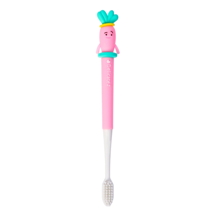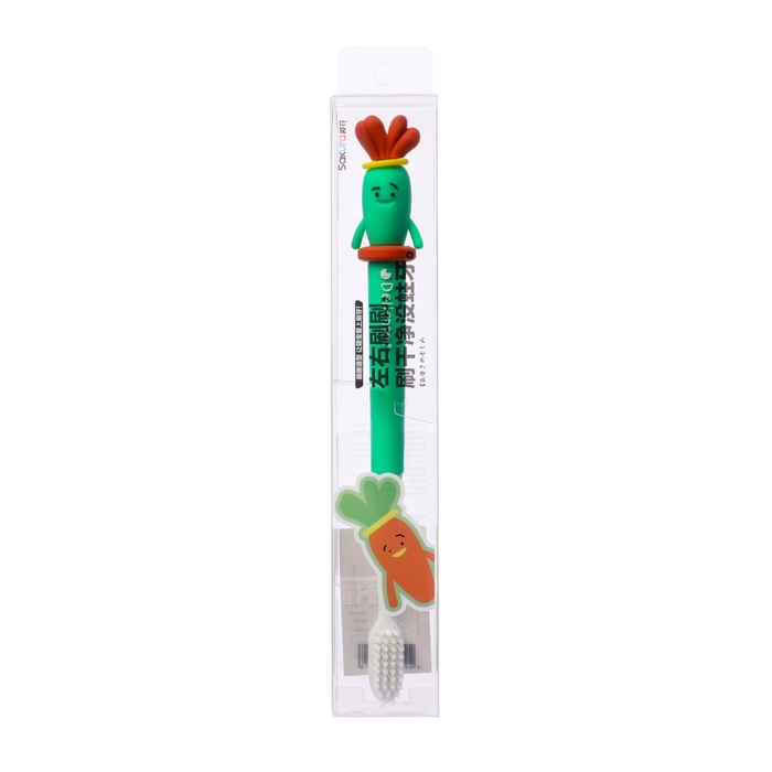 Нестандартный размер и форма чистящей головки обеспечивают доступ к самым потаённым уголкам детского рта. Ручка в форме морковки удобна для детской руки, не скользит и позволяет ребёнку легко контролировать процесс чистки. После использования щётку можно поставить на основание для вертикального хранения.