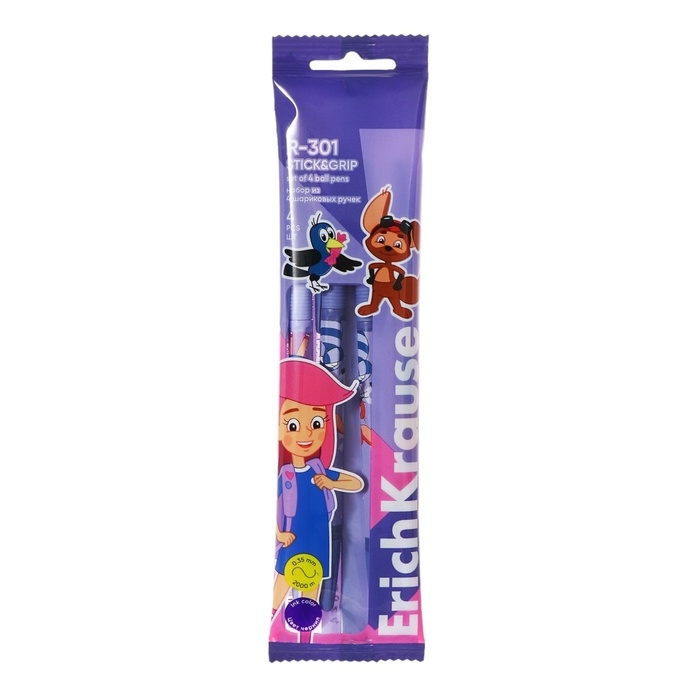 Набор ручек шариковых 4 штуки ErichKrause R-301 Stick & Grip "Простоквашино", узел 0.7 мм, синие, с резиновым держателем, европодвес
