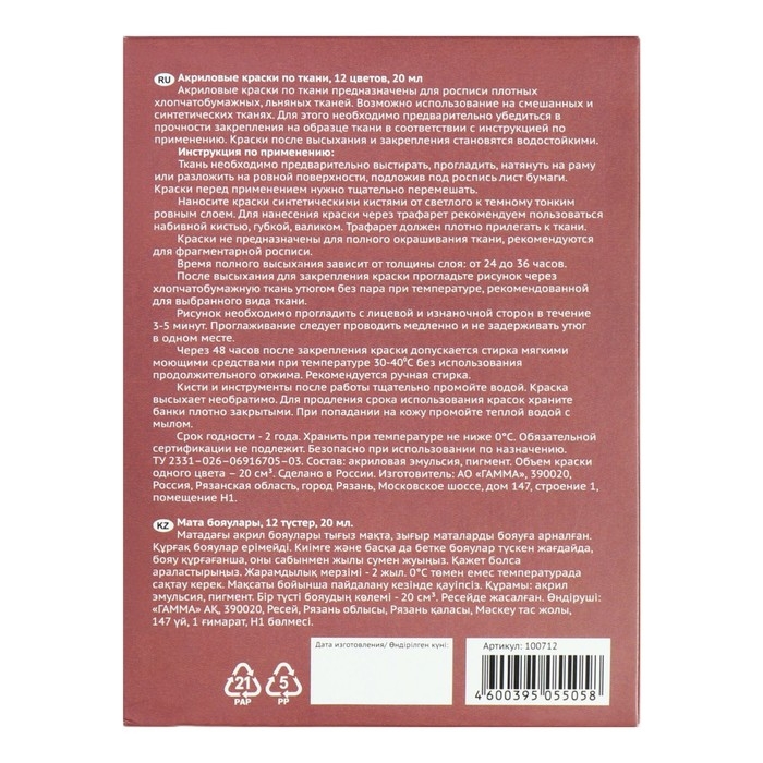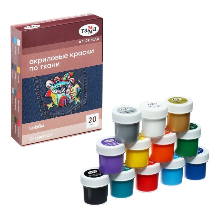 Краска по ткани акриловая, набор 12 цветов х 20 мл Гамма "Хобби" 100712