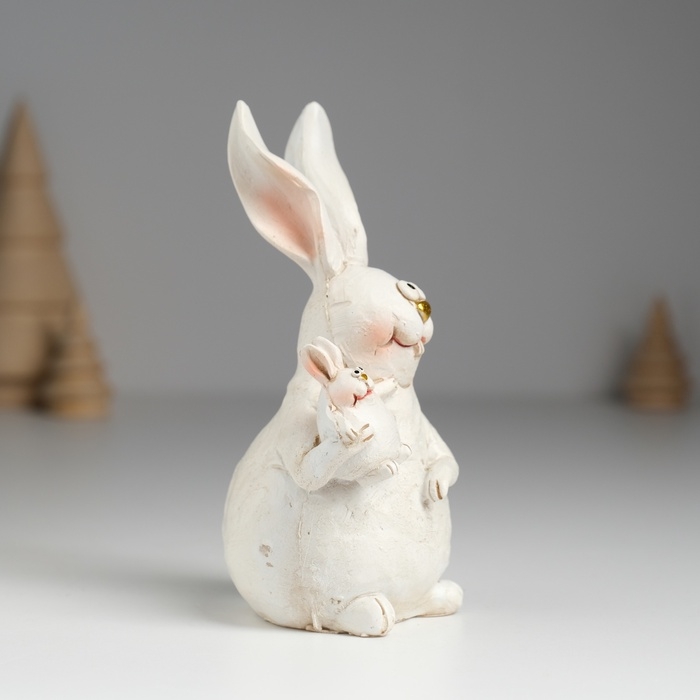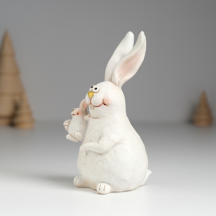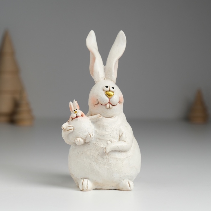 Сувенир полистоун "Кролик белый толстячок с крольчонком на лапах" 5,5х5,5х11,5 см см