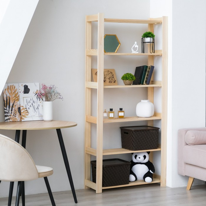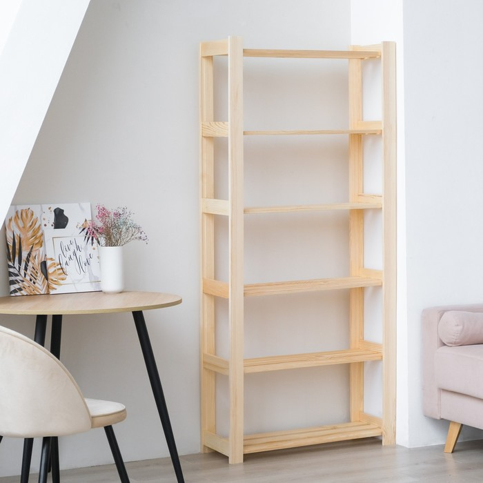 Открытый компактный стеллаж, сделанный из массива хвои, самый бюджетный в нашей серии. Он станет полезной частью гостиной, спальни, детской комнаты, квартиры-студии или офисных помещений.