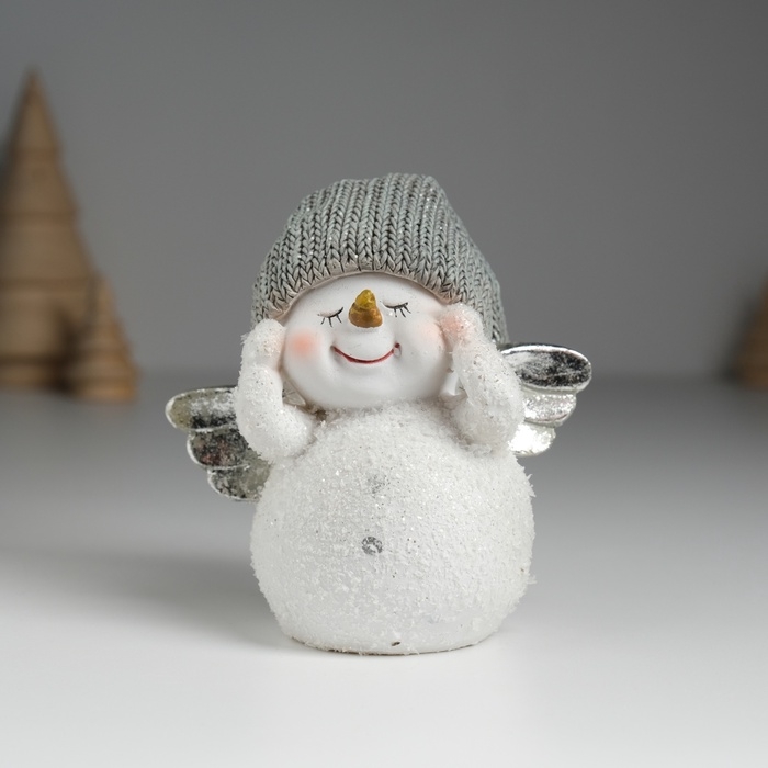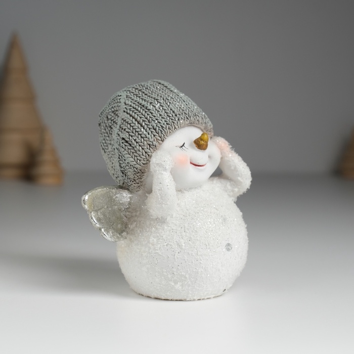 Сувенир полистоун "Снеговик белый с серебристыми крыльями, в вязанном колпаке" 9х6х9 см