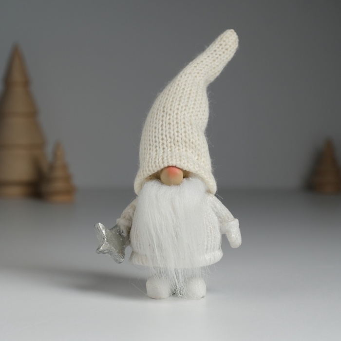 Сувенир полистоун "Дед Мороз в белом вязанном колпаке, с серебристой звёздочкой" 5х3,5х13 см 10326
