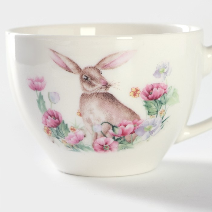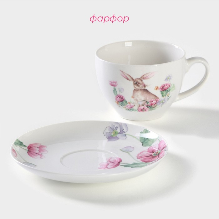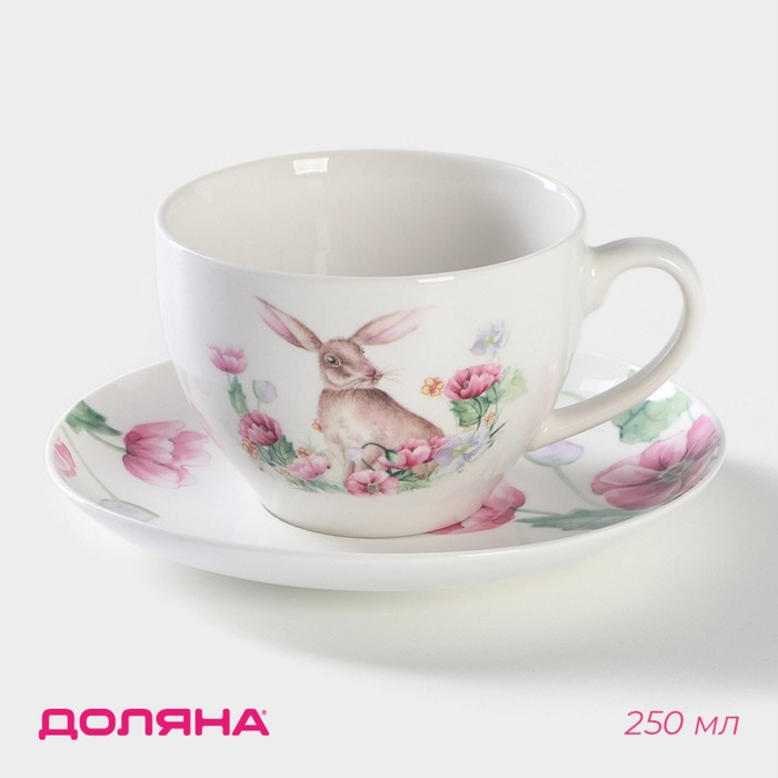 Чайная пара фарфоровая Доляна «Зайка», 2 предмета: чашка 250 мл, блюдце d=15 см, цвет белый