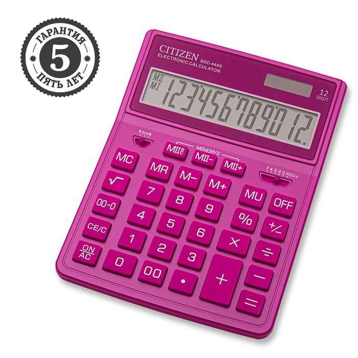 Калькулятор настольный Citizen "SDC-444XRPKE", 12-разрядный, 155 х 204 х 33 мм, двойное питание, розовый