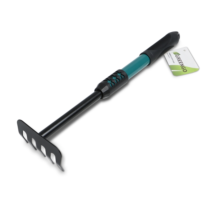 Грабли Greengo — многофункциональный помощник для сада и дачи. Такой инструмент отлично подойдёт для рыхления почвы — необходимого для правильного роста и развития растений процесса. Также с помощью данной модели удобно убирать сорняки и прочий органический мусор. Приспособление без труда разбивает большие комки и извлекает оставшиеся корни. Для вашего удобства рукоять изделия прорезинена.