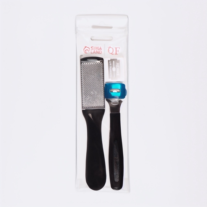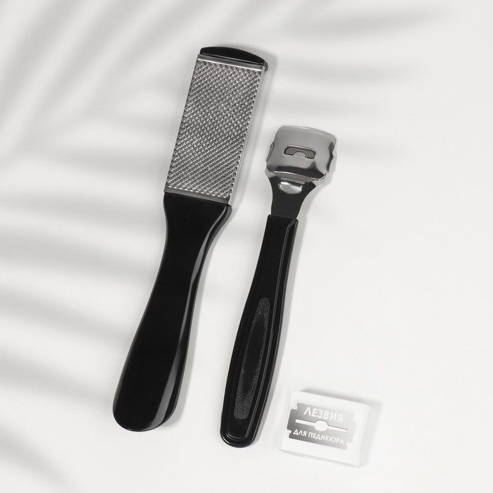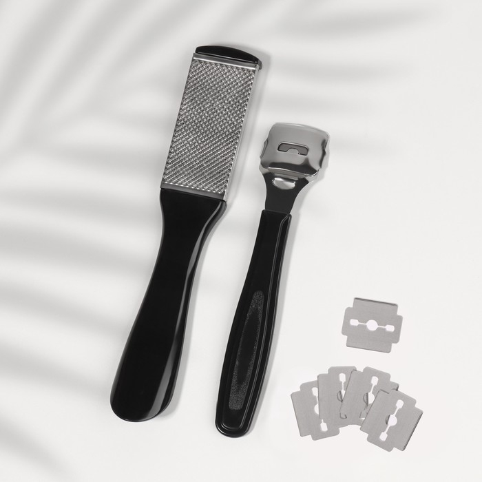 Состоящий из терки и педикюрного ножа с дополнительными лезвиями набор поможет своей обладательнице подготовить ножки к косметическим процедурам. Убрать несовершенства в виде натоптышей и мозолей с пяточек можно с помощью специального ножа: он аккуратно срежет огрубевшие части кожи. Если же шероховатости ножек не требуют серьезного вмешательства, то впору будет использовать терку для мягкого ухода за стопами.