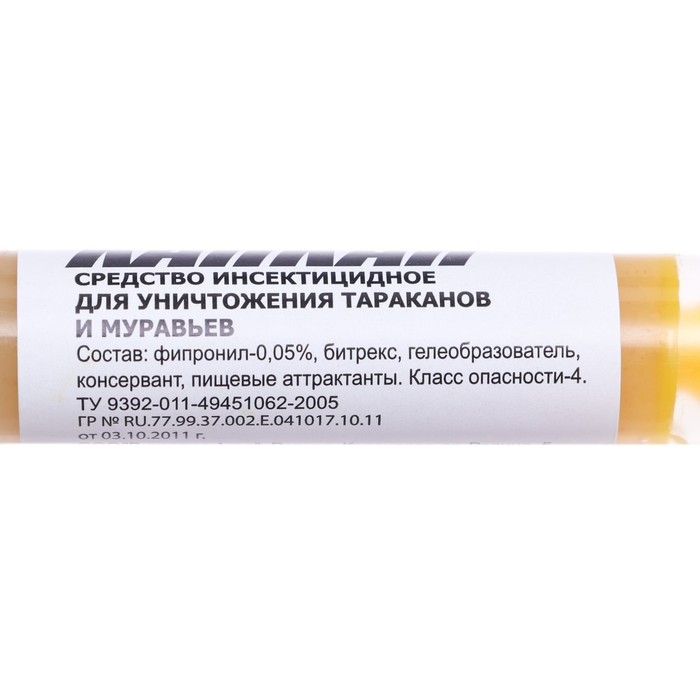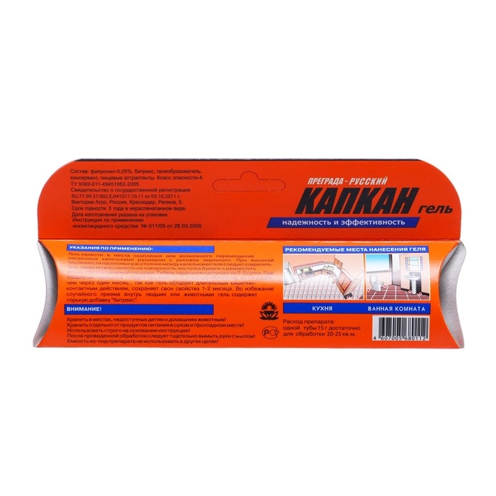ОПИСАНИЕГель от тараканов Русский КАПКАН фипронил 15 гр/50 Надёжное и эффективное инсектицидное средство предназначено для уничтожения всех видов тараканов и муравьёв. Указания по применению: гель нанести в местах скопления или возможного перемещения насекомых капельками размером с рисовое зёрнышко. При высокой численности вредителей расстояние между ними следует сократить. Гель также можно нанести на поверхность листочка бумаги и разместить на обрабатываемой площади. Гибель тараканов наступает на 2-е—3-и сутки. При появлении насекомых следует произвести повторную обработку, но не ранее, чем через месяц, так как гель обладает длительным кишечно–контактным действием, сохраняет свои свойства 1–2 месяца. Чтобы люди или животные случайно не приняли гель внутрь, средство содержит горькую добавку — битрекс. Состав: фипронил-0,05%, битрекс, гелеобразователь, консервант, пищевые аттрактанты. Класс опасности-4.