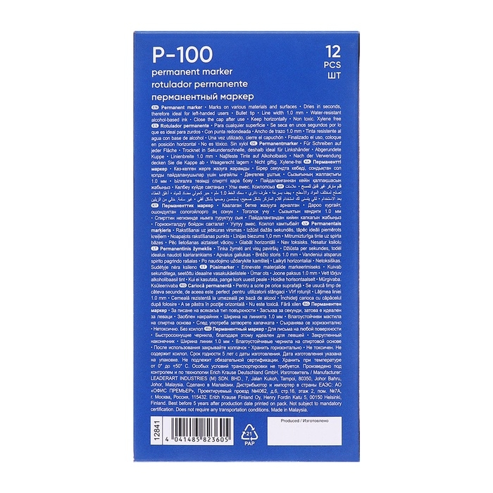 Универсальный тонкий перманентный маркер. Предназначен для письма и маркировки практически на всех поверхностях: бумага, картон, стекло, пластик, фарфор, керамика, дерево и др. Имеет круглую форму корпуса и цветной колпачок. Цвет колпачка и заглушки соответствует цвету чернил. Наконечник пулевидной формы, устойчивый к повреждению и истиранию. Толщина линии письма – 0.5-1.2 мм. Чернила на спиртовой основе, водоcтойкие, светостойкие, стойкие к ультрафиолетовым лучам, быстро высыхают после нанесения. Нетоксичные. Не содержат ксилол, толуол. Срок годности 5 лет.