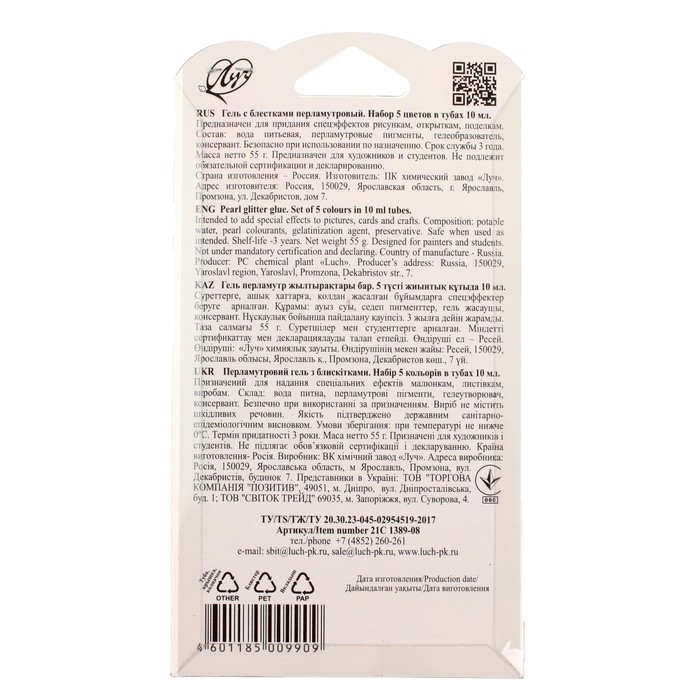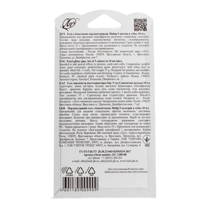 Гель с блёстками "Луч", 5 цветов х 10 мл, перламутровый
