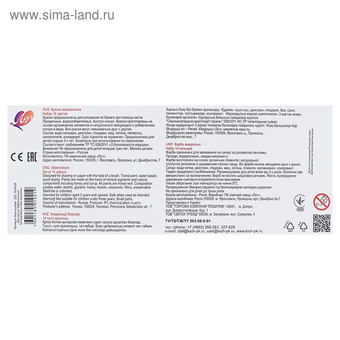 Акварель "Луч" ZOO, 14 цветов, без кисти