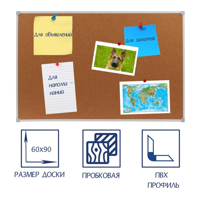 Информация крепится к доске при помощи булавок или силовых кнопок.Есть возможность горизонтального и вертикального расположения на стене.