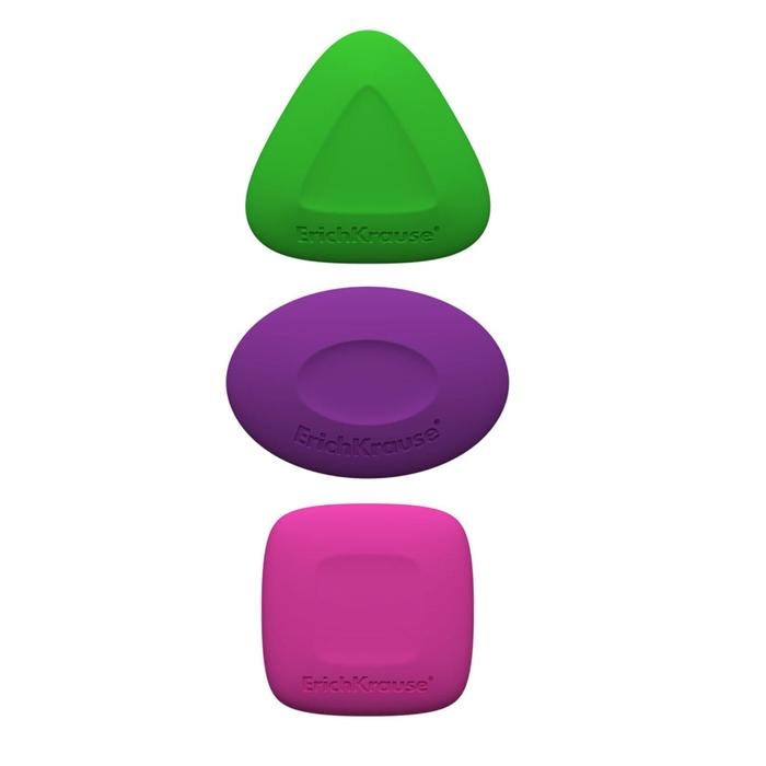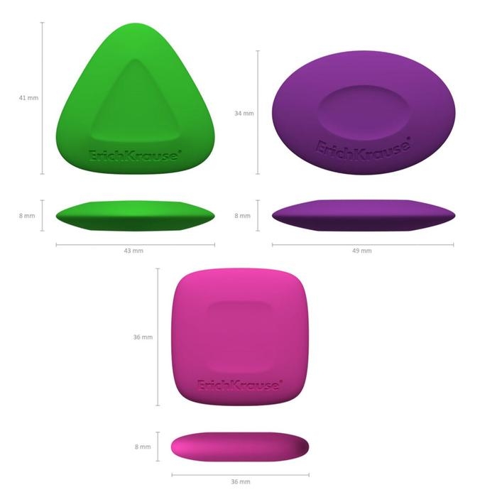 Ластик средней жесткости эргономичной формы из современного, экологически чистого и гипоаллергенного материала термопластичной резины (TPR) с пониженным образованием крошек (Dust free) выполнен в ярких неоновых цветах. В ассортименте 3 формы: овал, треугольник, квадрат. Не содержит ПВХ. Товар поставляется в нескольких вариантах формы/цвета, без возможности выбора.