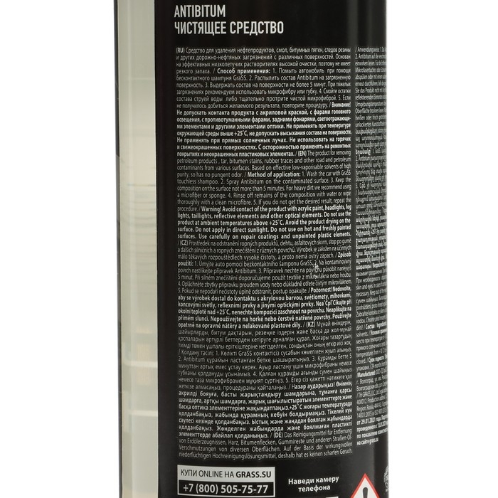 Средство Grass «Antibitum» предназначен для удаления нефтепродуктов, смол, битумных пятен, следов резины и прочих дорожно-нефтяных загрязнений с различных поверхностей. Безопасен для ЛКП, хромированных и стеклянных деталей.