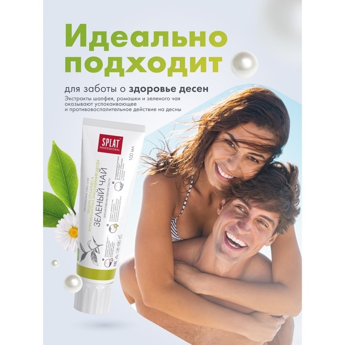 Зубная паста SPLAT Professional «Зеленый чай» разработана для защиты от кариеса и профилактики заболевания десен. Экстракты зеленого чая, шалфея и ромашки оказывают успокаивающее действие в полости рта. Натуральный жемчуг содержит кальций и аминокислоты для укрепления эмали. Биоконцентрат лаванды обладает мощным антисептическим эффектом и благотворно действует на десны. Инновационная система Sp.White System® безопасно отбеливает и полирует эмаль.
