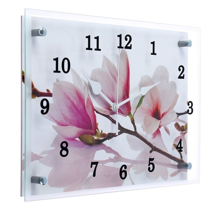 Часы из стекла Сюжет размером 25 х 35 см - это элегантный и стильный аксессуар, они имеют прямоугольную форму, которая добавляет особый шарм в интерьер вашего дома. Механизм бесшумный, батарейка формата АА, в комплект не входит. Тип индикации - арабские цифры, что делает время на часах четко видимым и легко читаемым.