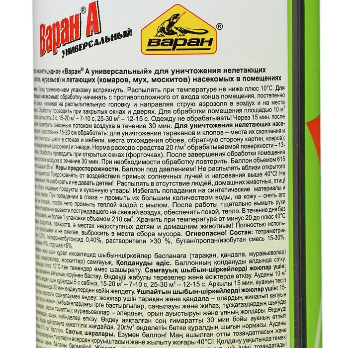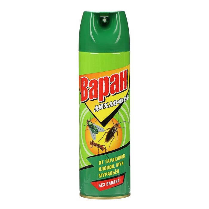 На природе и дома многие люди сталкиваются с клещами, клопами, москитами и другими опасными насекомыми, которые способны причинить массу вреда. Они переносят инфекцию, пьют вашу кровь и просто раздражают своим внешним видом. Вы устали бороться с ними? Дихлофос от торговой марки «Варан» — высокоэффективное средство для уничтожения ползающих (тараканов, муравьёв, клопов и т. д.), а также летающих насекомых (мух, москитов, комаров). Способ применения: перед использованием хорошо взболтайте, распылите. Состав: тетраметрин 0,12 %, циперметрин 0,2 %, пиперонилбутоксид 0,4 %, отдушка менее 5 %, функциональные добавки менее 5 %, смесь бутан / пропан / изобутан более 30 %, растворители более 30 %. Способ применения: перед использованием хорошо взболтайте, распылите.
