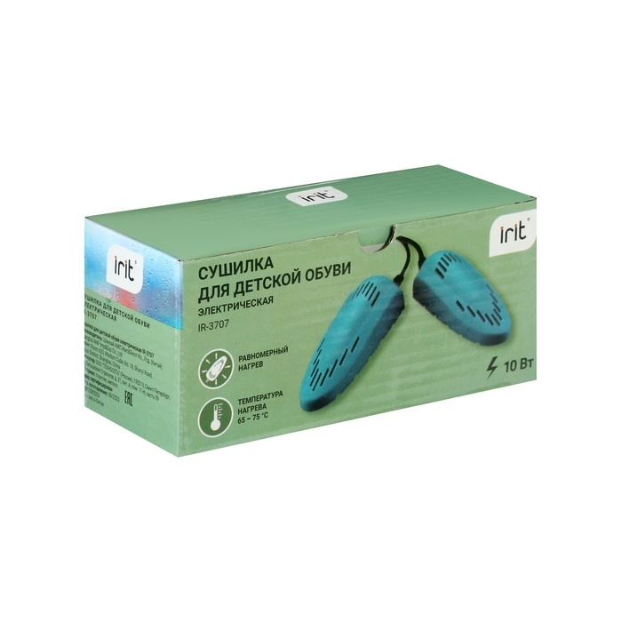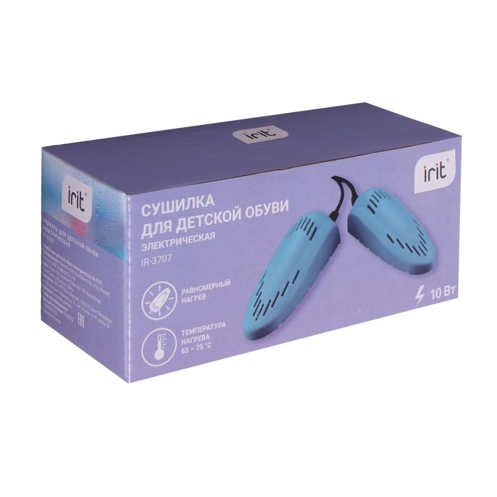 Сушилка для детской обуви Irit IR-3707 имеет металлический нагревательный элемент. Температура нагрева: от 65 до 80 °С.