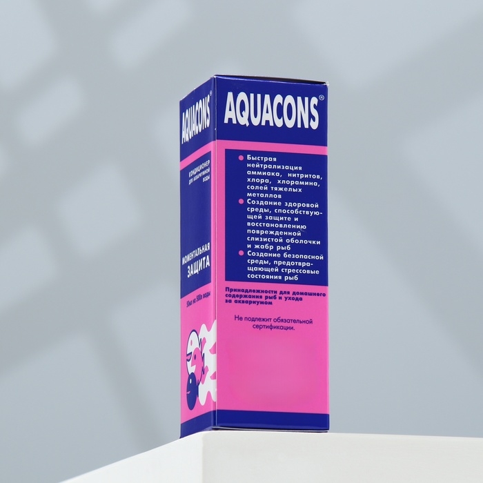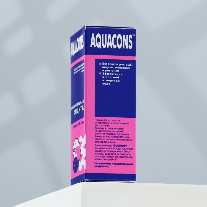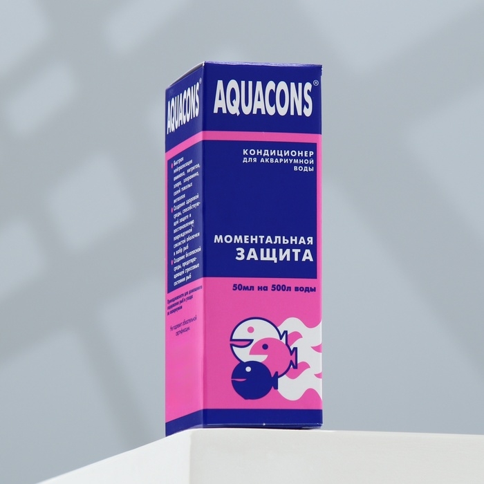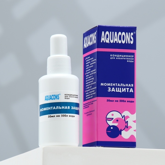 Кондиционер «Акваконс моментальная защита» для аквариумной воды 50 мл предназначен для нейтрализации аммиака, хлора, хлорамина и солей тяжелых металлов в морской и пресной аквариумной воде, что предотвращает отравление рыб, вызываемых этими вредными веществами. Также этот кондиционер способствует защите и восстановлению повреждений слизистой оболочки и жабр рыб, предупреждает и защищает рыб от различных стрессов, в том числе возникающих в процессе их транспортировки. Рекомендуется применять для карантинных аквариумов с новоприобретёнными рыбками. Способ применения: Определить наличие в аквариумной воде вредных веществ визуально по самочувствию рыб или с использованием специального тест-индикатора (не прилагаются). Кондиционер вносят в аквариум из расчёта 5 мл на каждые 50 л аквариумной воды. После внесения средства воду в аквариуме следует аккуратно перемешать. В рекомендуемом количестве кондиционер безопасен для рыб и аквариумных растений. Допускается пятикратное превышение указанной дозы в аквариумах без растений.