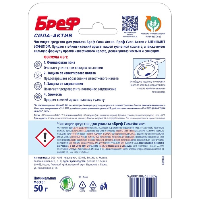Бреф Сила-Актив с АНТИНАЛЕТ ЭФФЕКТ – подвесной туалетный блок с формулой против известкового налета.