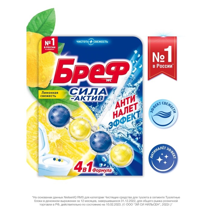 Блок для чистки и свежести унитаза 4 в 1, Bref Сила актив «Лимонная свежесть», 50 г