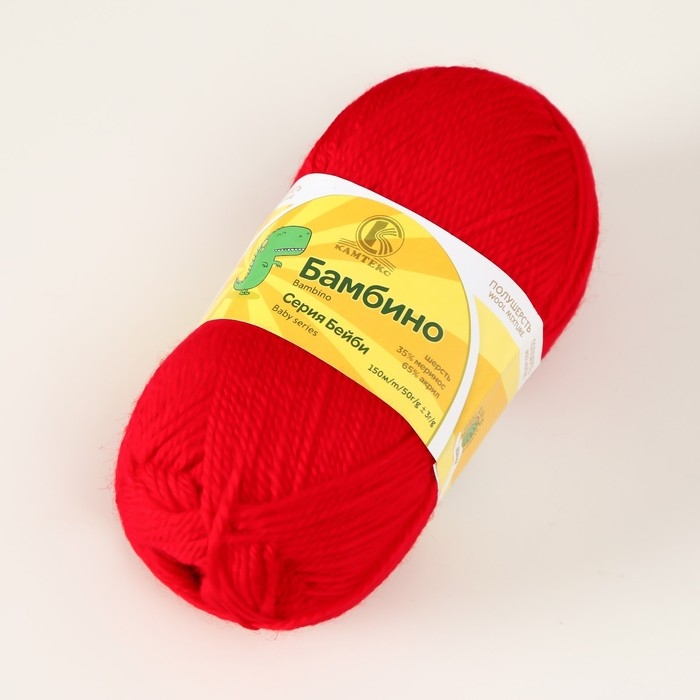 Пряжа "Бамбино" 35% шерсть меринос, 65% акрил 150м/50гр (046, красный), в составе которой присутствует акрил и элитная мериносовая шерсть, отличающаяся особым тонким, длинным и мягким волокном. Среди рукодельниц этот вид пряжи особо любим, ведь из неё легко, быстро и аккуратно вяжутся все изделия. Именно эту пряжу выбирают для создания детских вещей, и даже грудничкам вяжут различные пинетки, костюмчики, шапочки. Ниточка гладкая и шелковистая, ровно ложится в узор или рисунок, она абсолютна гипоаллергенна и не раздражает нежную кожу малыша. А благодаря выгодному сочетанию состава в вещах из «Бамбино» уютно в любое время года. Зимой — тепло, а летом — не жарко. Кроме того, за счёт мериносовой шерсти исключается «парниковый эффект», так как она отлично впитывает влагу.