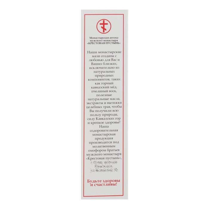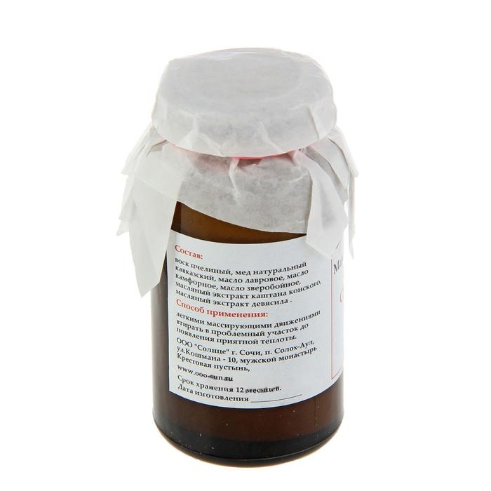 Состав: воск пчелиный, мёд натуральный кавказский, масло лавровое, масло камфорное, масло зверобойное, масляный экстракт конского каштана и девясила.