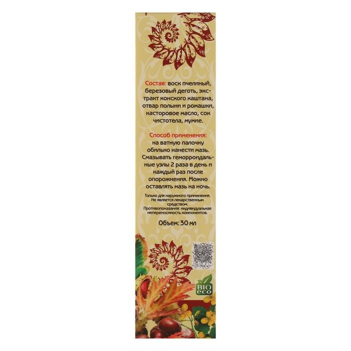 Состав: воск пчелиный, березовый деготь, экстракт конского каштана, отвар полыни и ромашки, касторовое масло, сок чистотела, мумие.